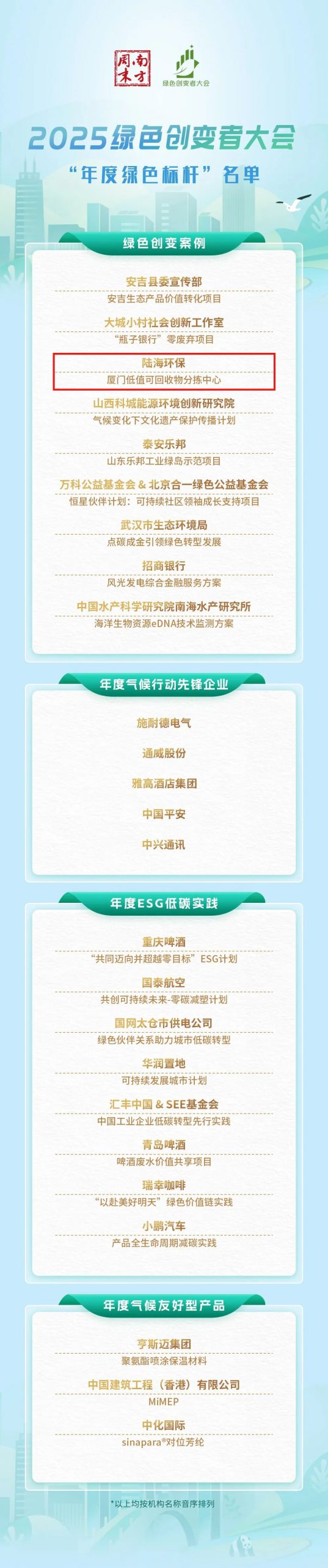 南方周末2025“年度绿色标杆“名单发布,陆海环保获选“绿色创变案例”