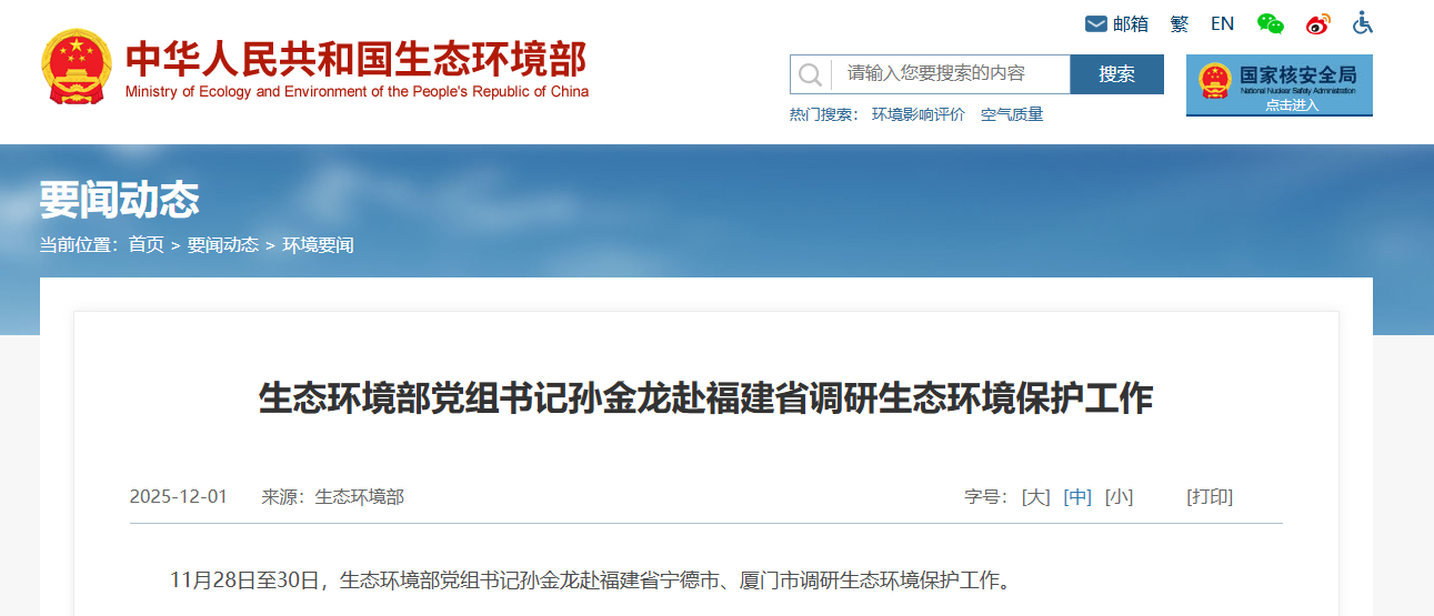 11月28日至30日,生态环境部党组书记孙金龙赴福建省宁德市、厦门市调研生态环境保护工作。